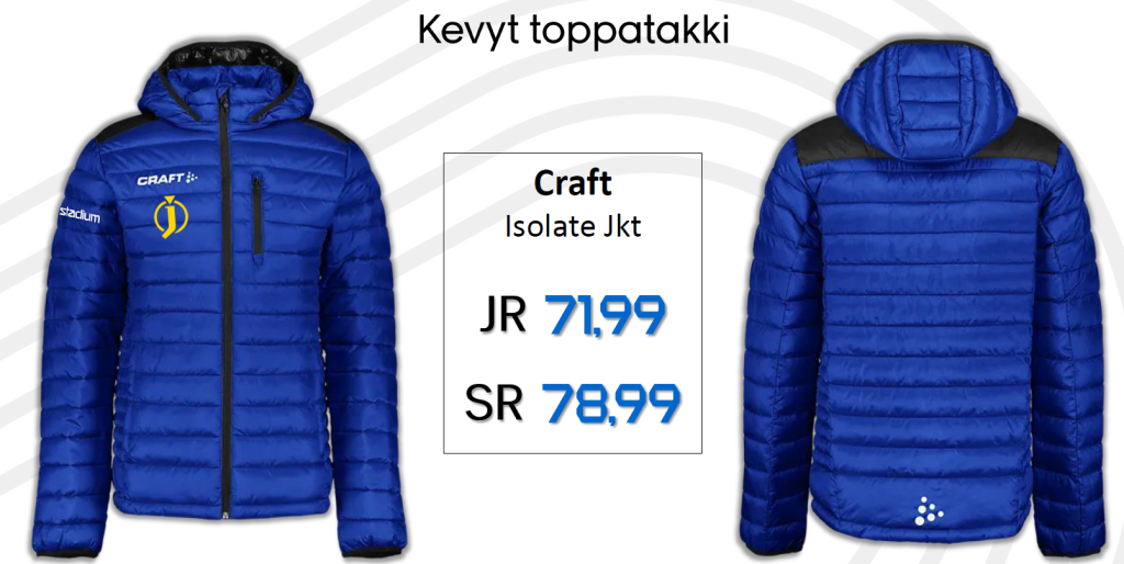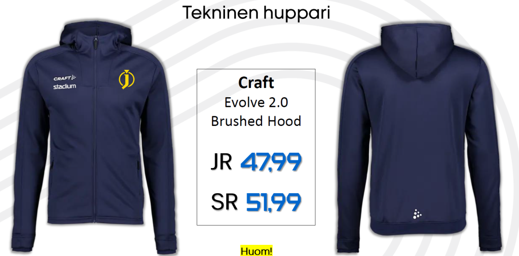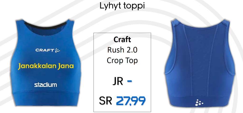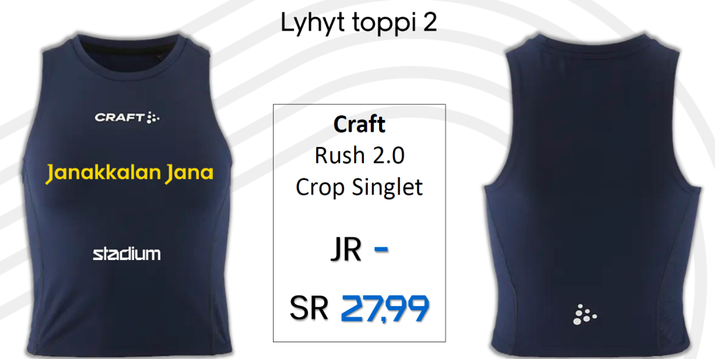 Sovitettavissa ovat kaikki verkkokaupasta saatavat Jana-tuotteet sekä myös yhteistilauksena toimitettavat tuotteet (toppatakki, tekninen huppari, lyhyt toppi ja lyhyt toppi v2). Kuvia tuotteista pääset selaamaan verkkokaupan sivuilta ja yhteistilauksena toimitettavat tuotteet näet tältä sivulta.